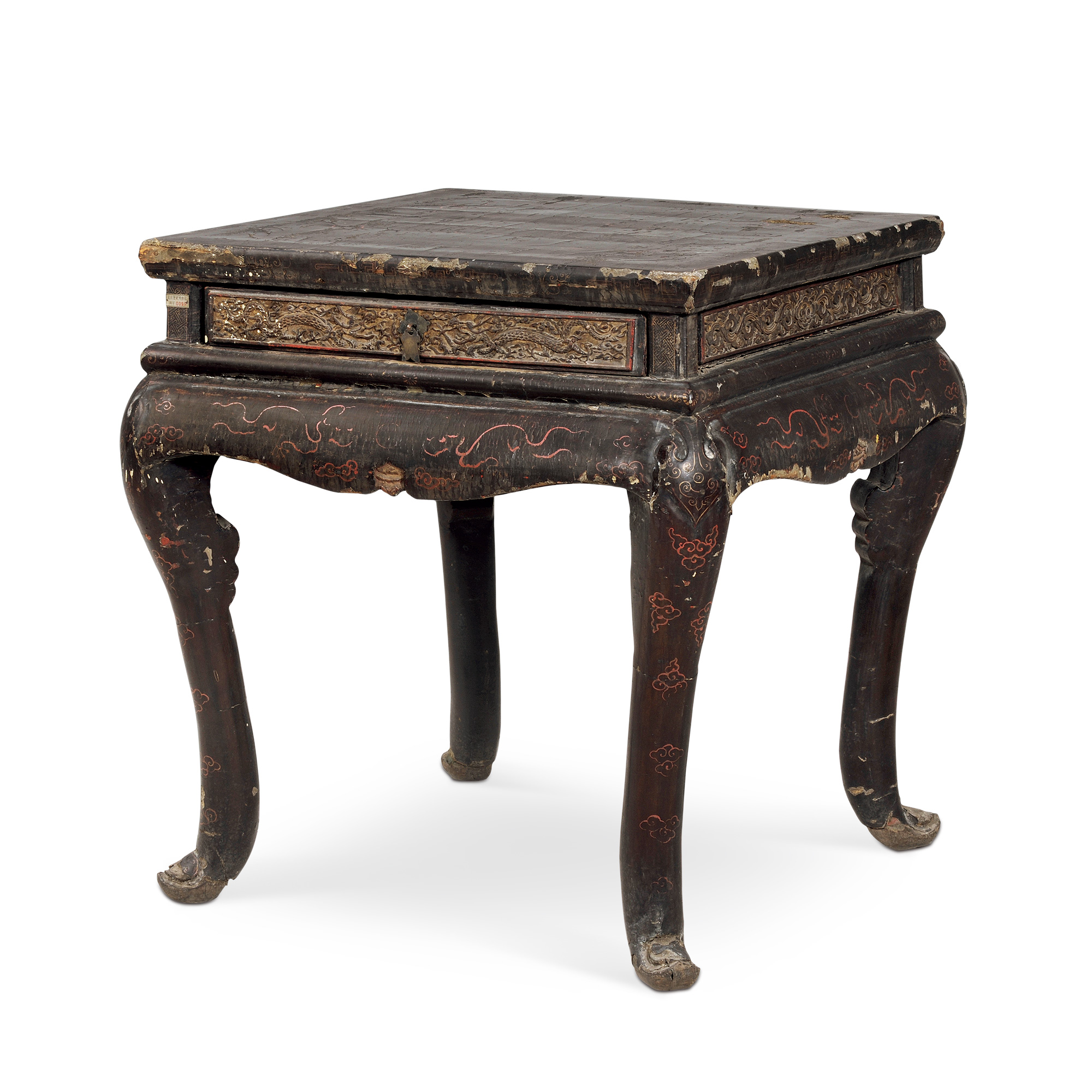 黑漆描金彩绘带抽屉雕龙纹三弯腿供桌 明末清初