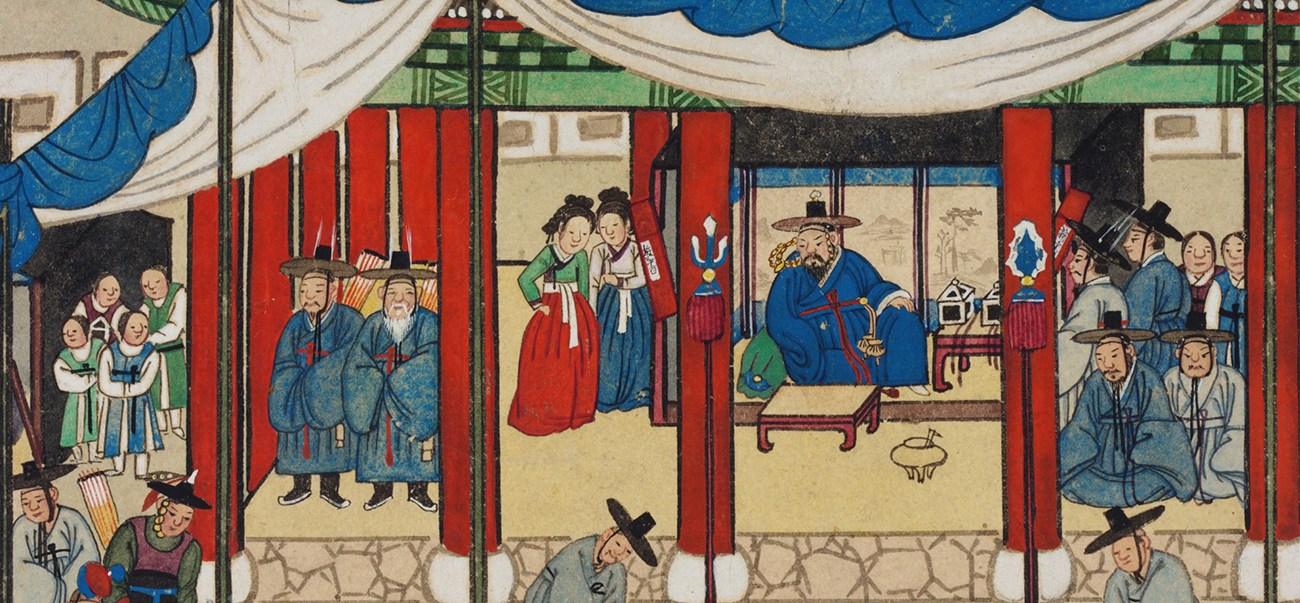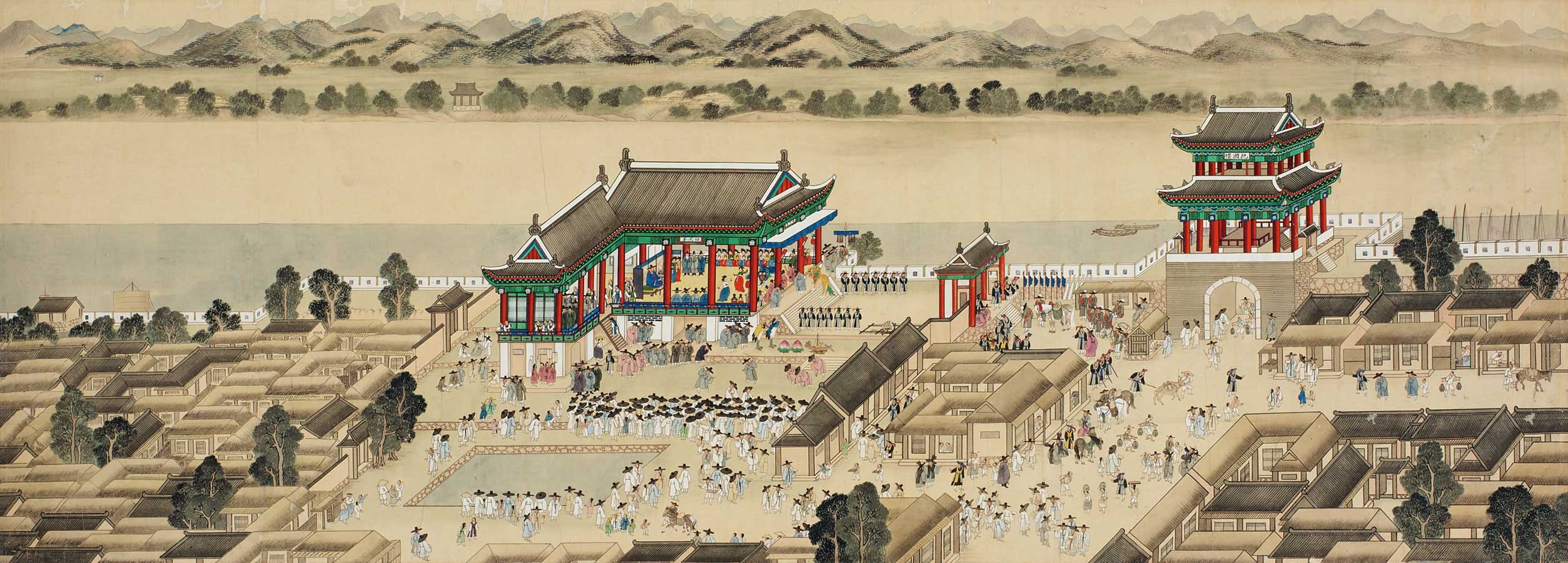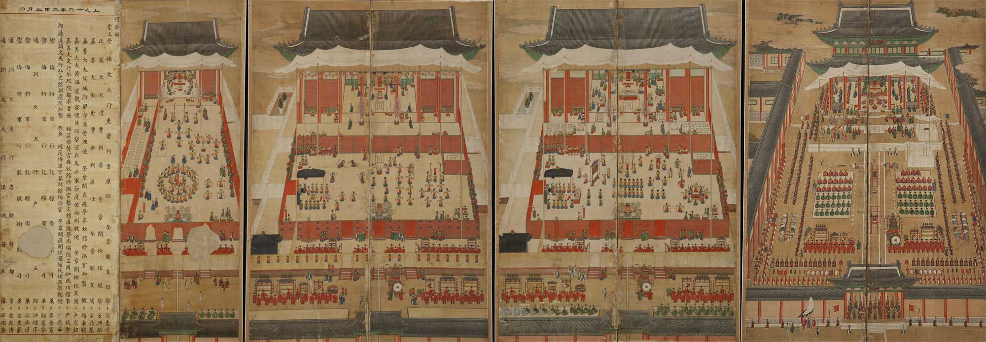 《戊申进馔图》是19世纪朝鲜皇宫行事图的典型之作。戊申年即1848年,朝鲜宪宗(1834—1849年在位)称之为“千之一回庆年”。为庆祝纯元王后(宪宗祖母)的六旬大寿与神贞王后(宪宗母亲)的望五(41岁)之寿,宪宗依先例举行上尊号礼,并在昌庆宫举办宴饮活动以示纪念。据记载,是年3月17日,先于通明殿举行内进馔和夜进馔;两天后,即3月19日,又举办翌日会酌与翌日夜宴。《戊申进馔图》描绘的就是这四次宴饮活动:右起第1、2幅名为《仁政殿陈贺图》,第3、4幅名为《通明殿内进馔图》,第5、6幅名为《通明殿夜进馔图》,第7幅为《通明殿宪宗会酌图》, 第8幅为进馔处即堂上与廊厅的座次表。