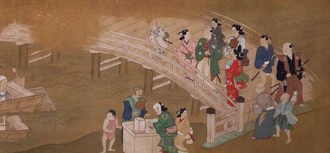 自北向南流淌的隅田川是江户的代表性河流之一,位于江户东部的日本桥地区。这里是江户经济的核心所在,不仅有幕府和大名的米仓,还是白酒、木材等商户的聚集地。隅田川上既有载货船只川流不息,又有市民乘船水上游览,尤其是在春季观赏樱花和夏季燃放烟火的时节,更是热闹非凡。自17世纪上半叶起,为护堤岸,开始在隅田川沿岸大量种植樱花,向岛和浅草等地作为赏花胜地,更是吸引大量游客前往游玩。