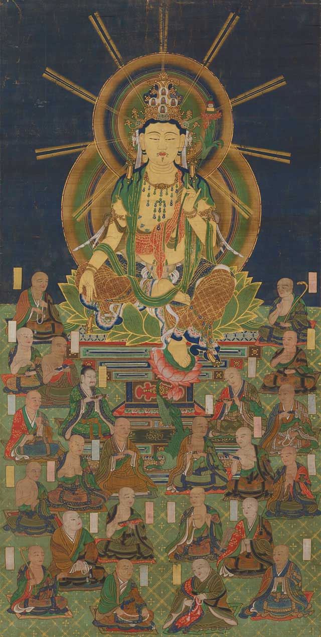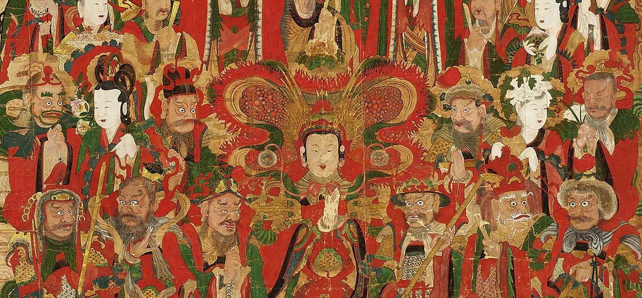 公元4世纪,佛教由中国传入韩国,佛教文化得到接受。在佛教盛行的高丽王朝,佛教画以线条精巧、纹样华丽和泥金描绘为特征,出现了许多贵族阶层为王室祈愿的画作。朝鲜王朝实行崇儒抑佛政策,佛教备受打击,但在民间却得到广泛流传。因佛教与民间信仰相结合,这一时期的佛教画带有浓厚的世俗色彩,并发展出新的主题和风格。