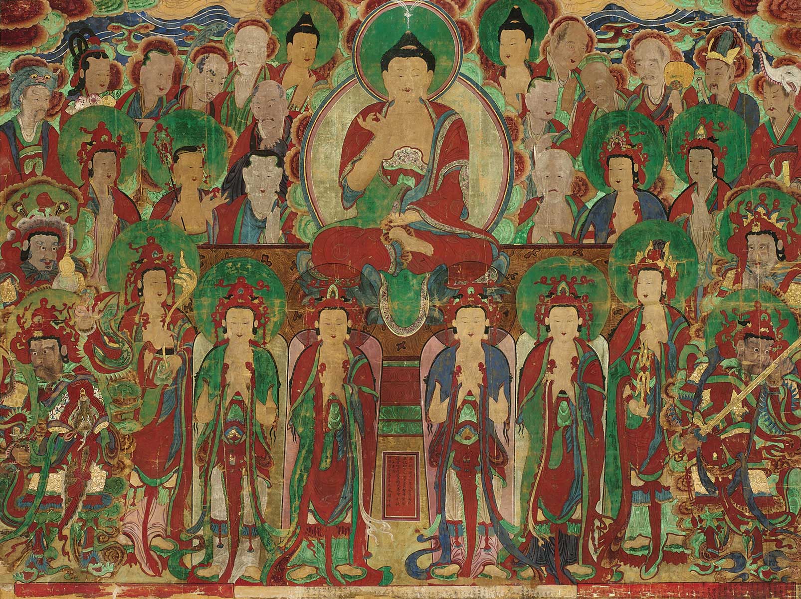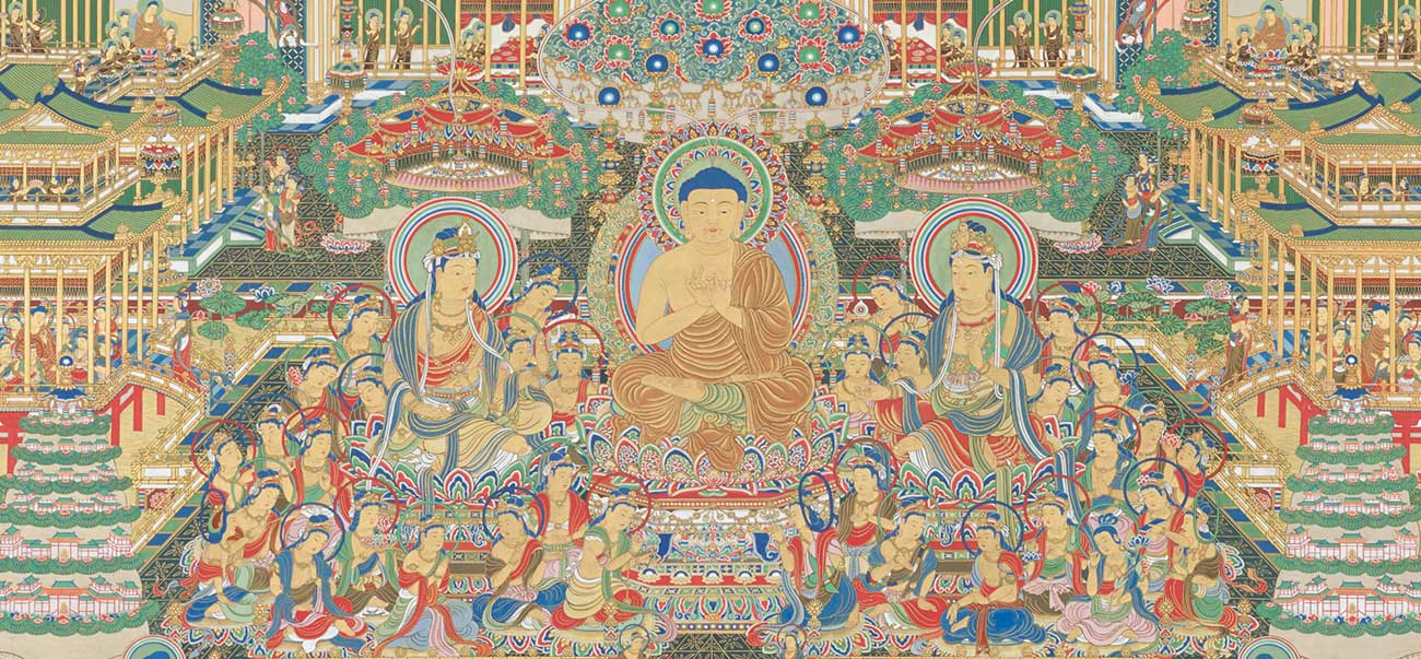 这幅《阿弥陀佛会图》描绘了极乐世界里阿弥陀佛说法的场面。画面中央,阿弥陀佛端坐在高大宽广的木理纹佛坛上。佛坛后站立十大弟子、四位菩萨,以及头戴狮子冠的乾达婆和头戴象冠的夜叉,他们正在倾听佛祖说法。佛坛前是合掌而立的四位菩萨,分持金刚杵和如意的帝释天和梵天,以及手拿宝剑等法器的四天王。