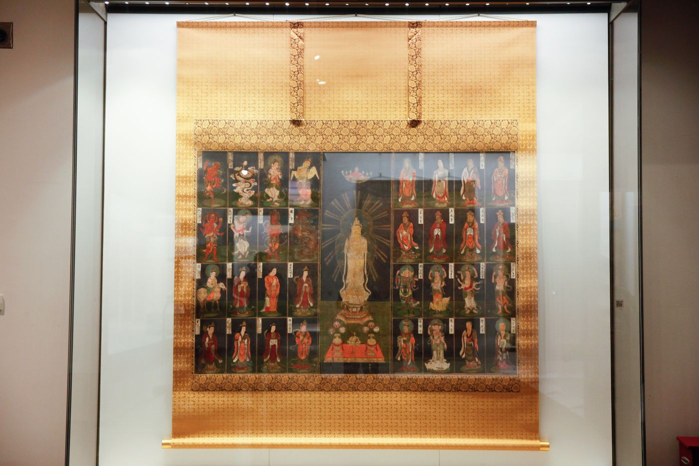 据《妙法莲花经普门品》(《观音经》)所载,观音菩萨大慈大悲、有求必应,苦难众生只要诚心念诵其名,菩萨就能即刻“观”到其声,前去拯救,为之解脱苦恼,并现三十三种化身。通常以一面二臂观音像为基础,变化而出的十一面观音、千手观音及如意轮观音等“三十三应身”广为人知。此画表现了观音以外化身的三十三种应身佛像,反映出多种观音信仰方式。