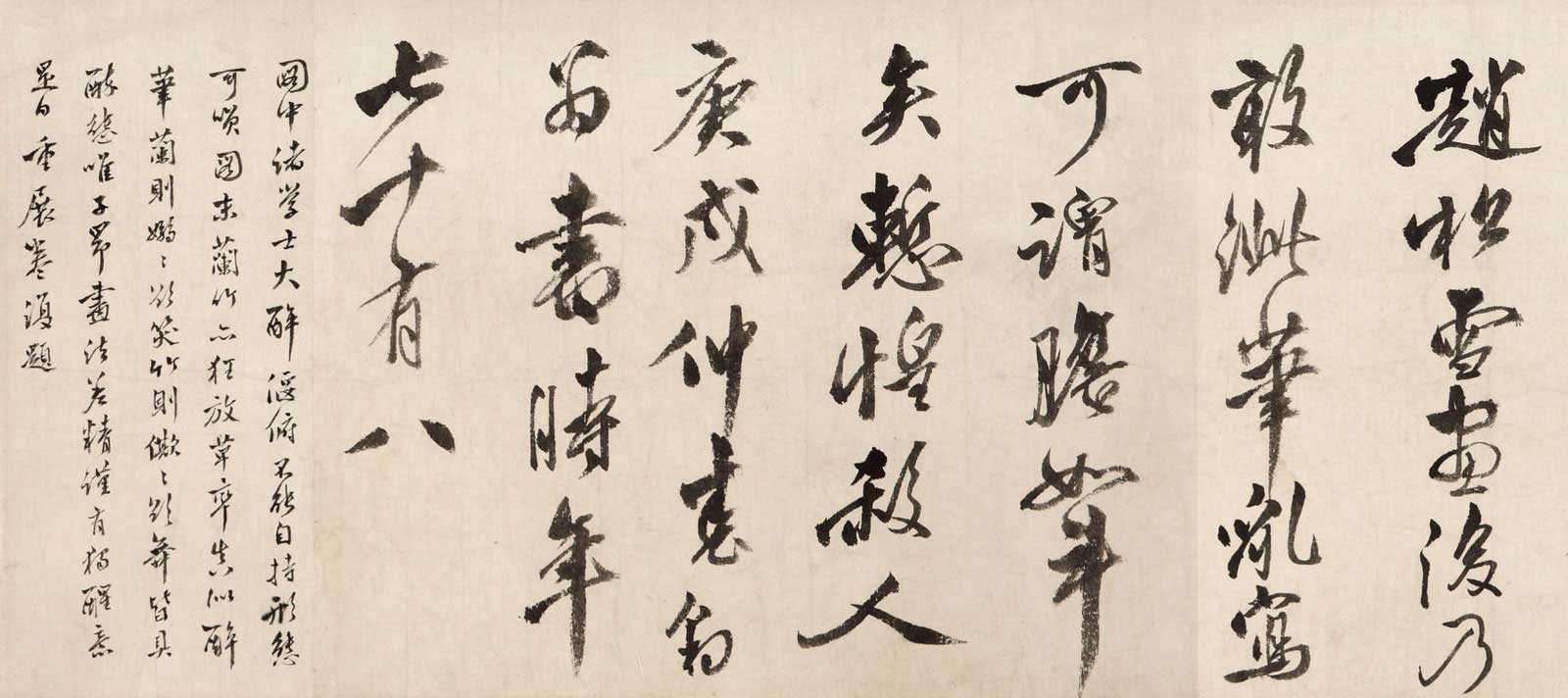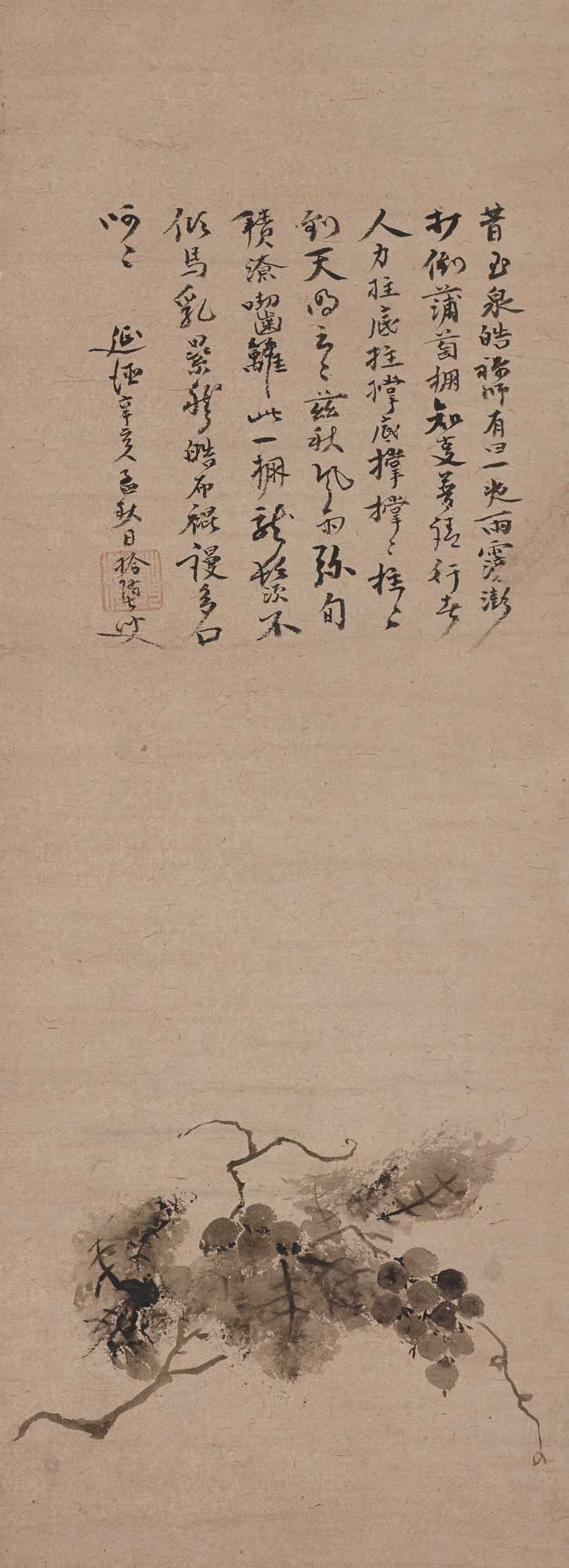 徐渭(1521—1593年),字文清,更字文长,号天池、青藤老人,又号青藤道人,山阴(今浙江绍兴)诸生。曾为闽都胡宗宪幕府,后入狱,精神失常,晚年著书鬻画。工画残菊败荷,炉瓶彝鼎之属,皆古质雅淡。兼绘山水,则纵横不拘绳墨。尝自评:“吾书第一,诗二,文三,画四”。