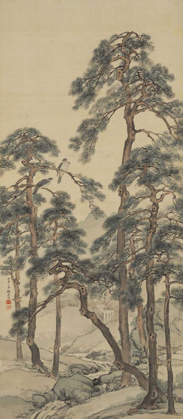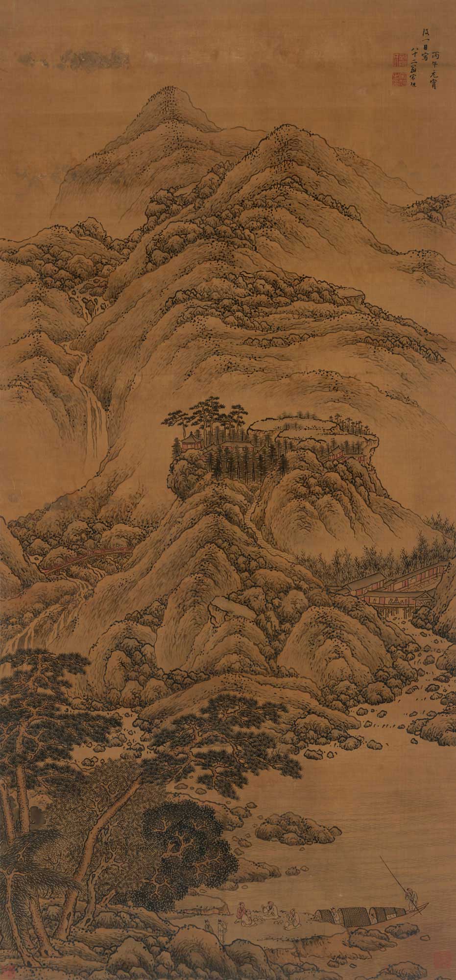 本幅《古木晴川图》为王翚晚年作品,见于清代陆时化所著《吴越所见书画录》卷六,题作《王石谷仿荆浩山水立轴》,陆氏称此图“位置丘壑宛似北苑《溪山行旅图》,老年笔墨如此出色者甚少。”又见于李佐贤所著《书画鉴影》卷二十三,题作《王石谷仿荆浩春山行旅图轴》,描述其“青绿色兼工带写,石兼披麻折带,小斧劈皴。下段乔木松灌木中藏人径,一朱衣人策蹇,奚童随行,后两人亦策蹇,一人随行。坡下波涛汹涌,渔舟并泛,每舟二人,一作撒网状。中段水村幽居,上段高峰叠峙,山坳圆亭,茂林映带中露梵宫。”确如李氏所言,此图景深层次丰富,山体坡石既有披麻皴造成的松软,也有小斧劈皴所表现出的陡峭坚实质感,虽然干笔皴擦居多,但施以薄而淡的色彩,滋润且明快,而涌动的水流,烟云笼罩的古木更显气势不凡。虽称“仿荆浩笔意”,但已化古为新。