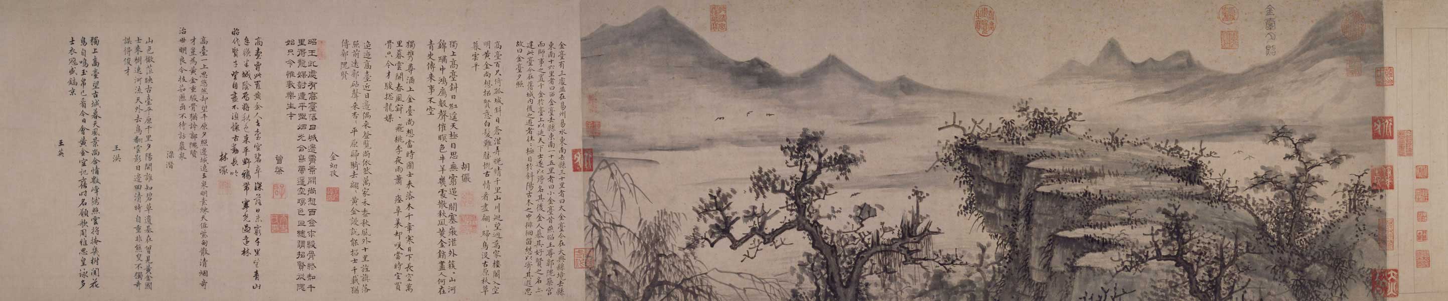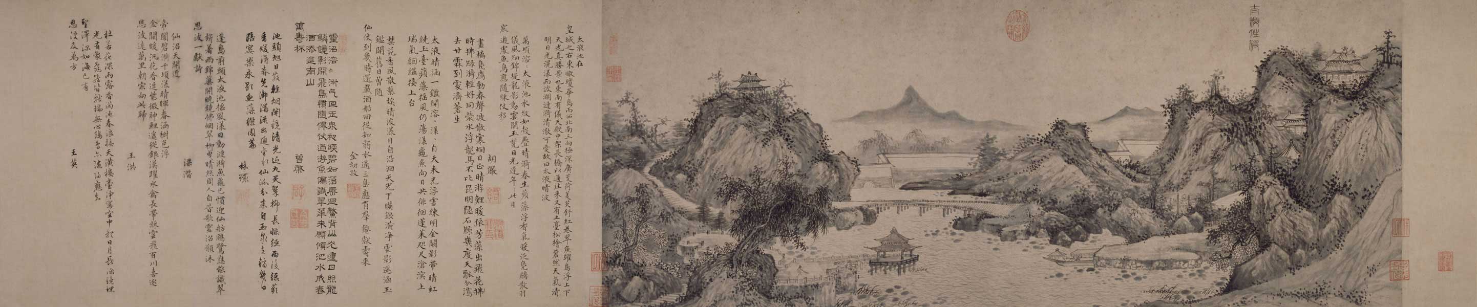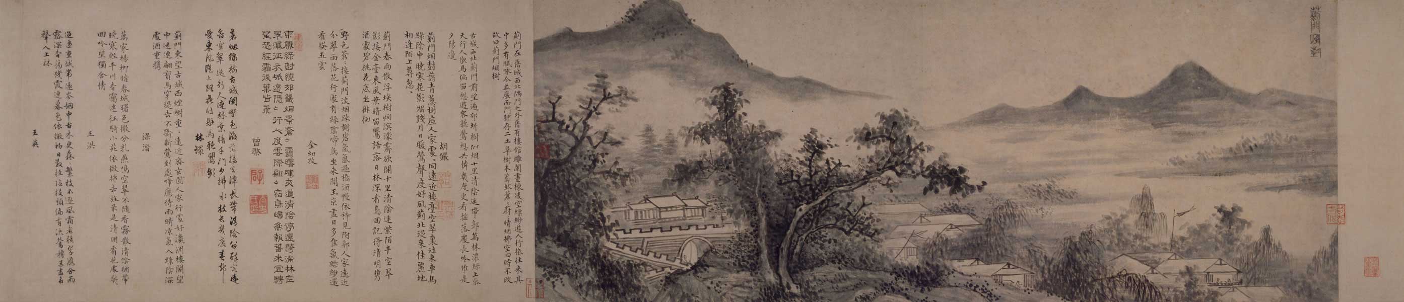 此《北京八景图》绘于王绂第二次扈从明成祖朱棣巡狩北京之后,是以所见之景为基础进行创作的实景山水,通篇墨色湿润淡雅,苔点繁密,古意盎然。画面布局及用笔与王绂其他代表作,如《秋林隐居图》、《凤城饯咏图》、《山亭文会图》等相一致,是现存王绂作品中水准最高之作,代表了明初山水绘画的面貌。
