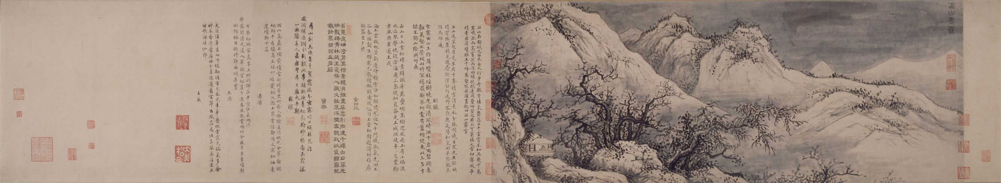 文征明所画雪景山水,见于著录者约有四十余幅,其中不乏依同一题材创作的不同画作。这幅《雪景山水图》的绘画风格较晚,与之相类的有台北故宫博物院所藏文征明《雪归图》。本图著录于《石渠宝笈续编》,画上乾隆题诗收录于《清高宗御制诗》。