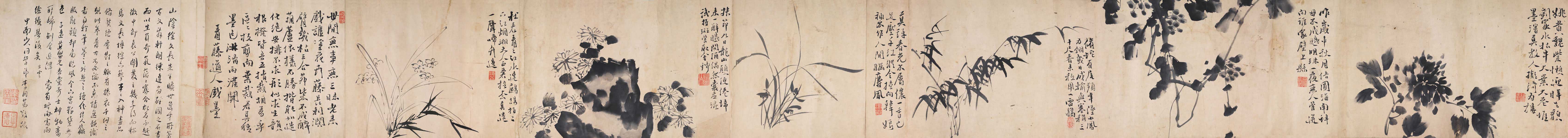 此《杂画图》由六幅花果、自题论画诗以及清初学者李因笃的题跋组成。此卷第一幅为《牡丹图》,大花大叶,浓墨一气泼就,自然生动;第二幅为《葡萄图》,构图精巧,画法流畅,墨色浓淡相宜,恰在似与不似之间;第三幅为《春竹图》,浓枝淡叶,意致潇洒;第四幅为《兰花图》,兰叶浓淡疏密有致,线条生动,花以浓墨三四笔点出,形态秀美;第五幅为《菊石图》,一石居中,左右出花,石浓花淡,别有情趣;第六幅为《清竹水仙图》,水仙淡墨双钩,下画青竹一枝。此卷是徐渭花鸟题材的经典之作,充分发挥写意花鸟的水墨语言,山石、果实率意点抹,兰花及水仙又充分利用墨线的轻重生动表现,对后世花鸟画尤其是朱耷、齐白石的影响很大。