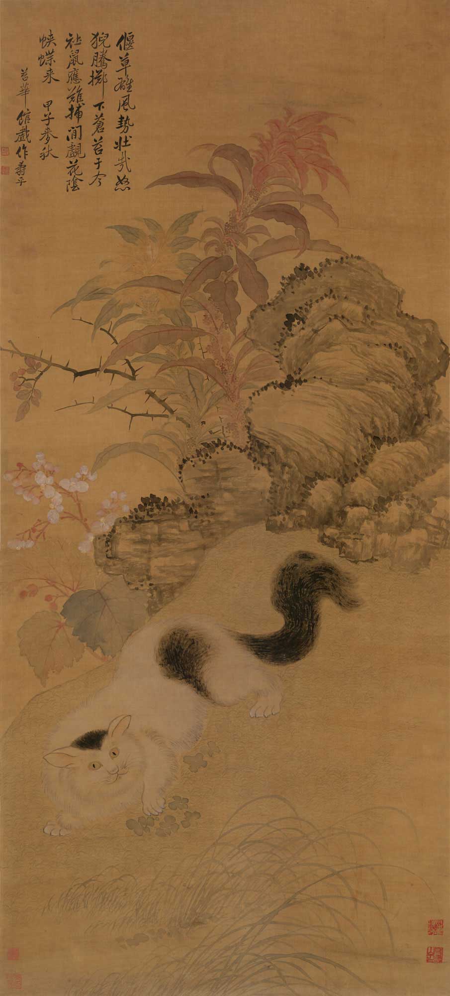 画面左上方为恽寿平自题七言绝句一首,见于《瓯香馆集》卷十,诗名为《题画猫》。因“猫蝶”与耄耋谐音,故此题材常作祝寿之用。但从题诗来看,恽寿平显然意不在此,而是借用猫和蝶来表达怀才不遇的政治隐喻。诗文前两句描写了“怒猊”威风凛凛的动态,与画中蓄势待发的狸猫相呼应,后一句“社鼠难捕”笔锋一转,表达出英雄无用武之地、只能闲觑花阴蛱蝶的无奈情怀。