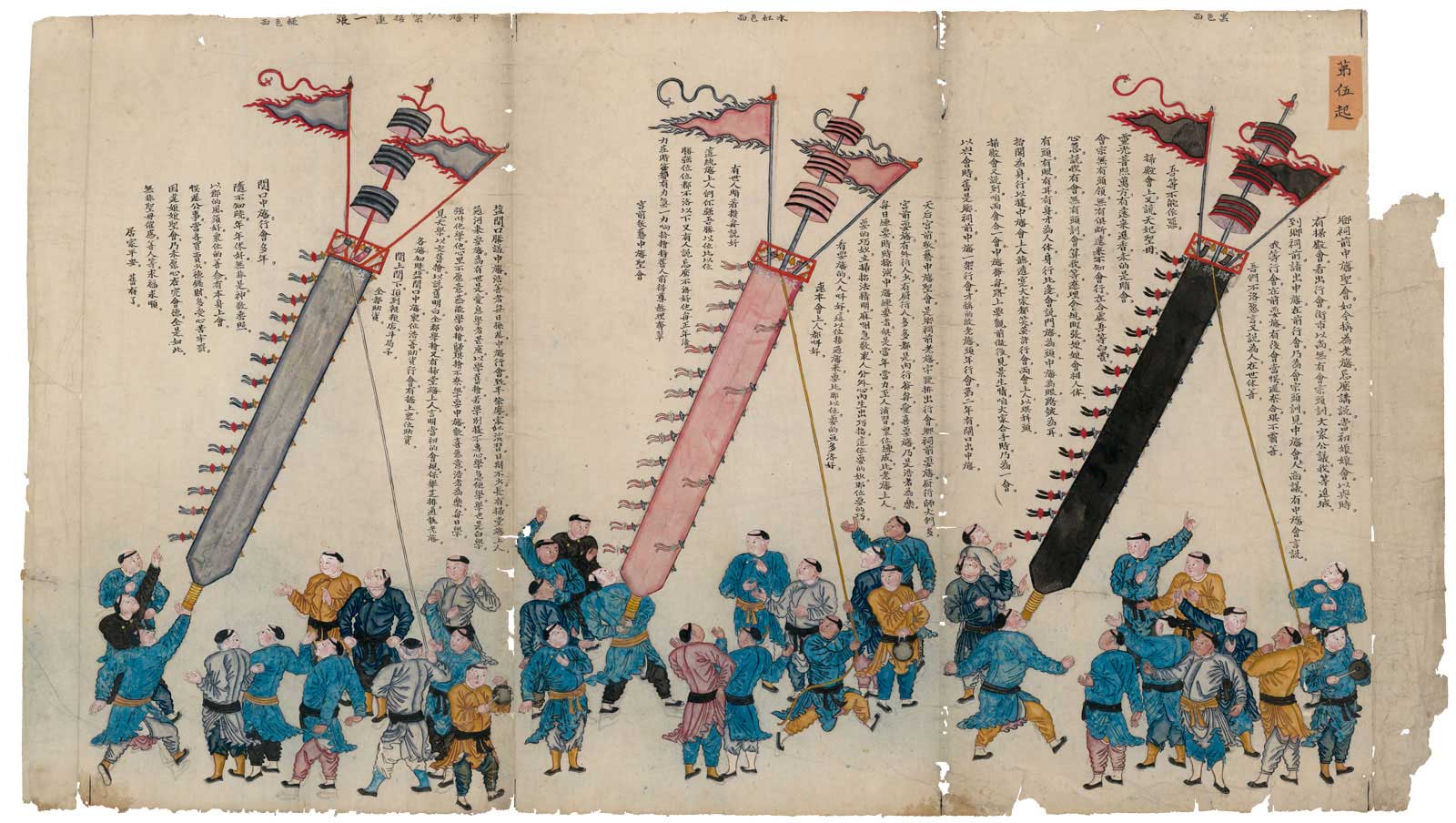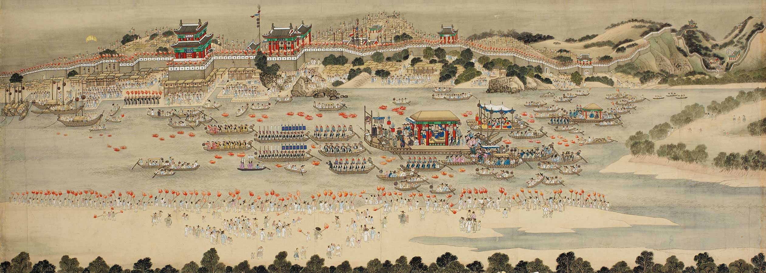 第一幅《浮碧楼宴会图》描绘了在大同江畔的浮碧楼上,为平安监司接风而举办的宴会。与朝鲜王朝宫中行事图表现一致,画中浮碧楼前搭有遮阳篷,侧面挂有“浮碧楼”牌匾。通过日治时期(1910—1945年)拍摄的照片来看,当时浮碧楼的前面与侧面均有匾额。在楼前的院子中,7位乐师正在演奏,舞女随音乐翩翩起舞,舞蹈内容有处容舞、鼓舞、剑舞等。浮碧楼两侧有很多围观的普通平民,其中有拄拐杖的老人、背孩子的妇女,还有艺妓。第二幅《练光亭宴会图》表现了在练光亭里举办的欢迎宴会,平安监司端坐于练光亭中央,欣赏艺妓的歌舞表演。同时,在亭下的院子里,两个儒生手拿棍子,似乎在进行某种比赛,四周围有看热闹的人群。旁边大同门前的街市热闹非凡,有挑担运货的挑夫、贩卖糖果的小贩,还有头顶水罐的妇女,各色人等,形态各异。练光亭为朝鲜“关西八景”之一,建于大同江畔峭壁之上,歇山式屋顶,南北相连,呈现出杰出的建筑之美。第三幅《月夜船游图》通过表现活动全景,刻画了为祝贺平安监司赴任而举行船游的盛大场面。图中人们手举火把,沿江而立,观赏江上庞大、华丽的游船。