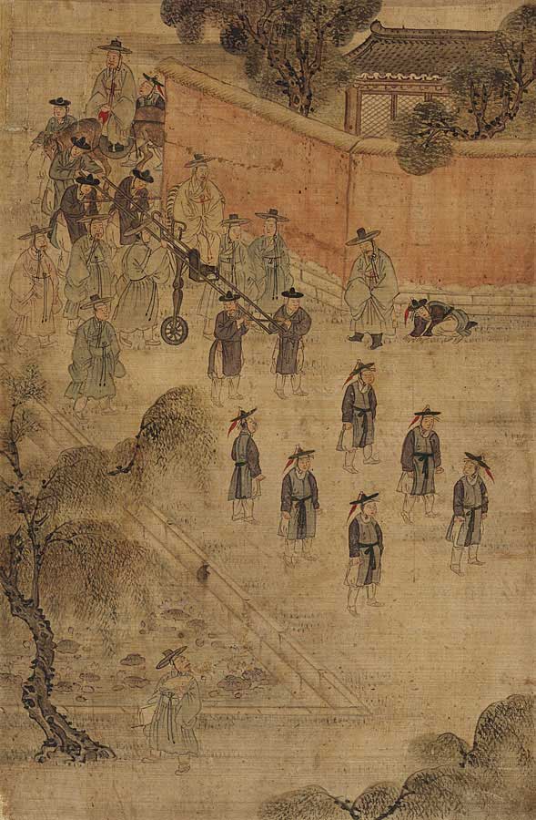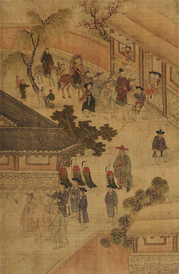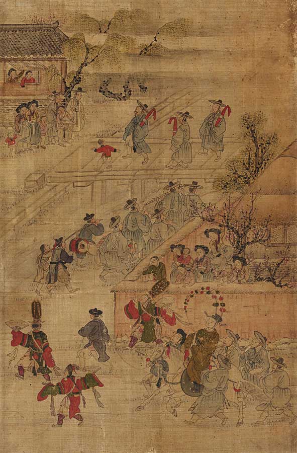 朝鲜王朝后期的风俗画是韩国最具特色的绘画之一。在文人士大夫阶层的积极引导下,以金弘道和申润福为代表的风俗画家,通过生动的构图和简洁的笔触,真实地表现了传统农耕社会的日常活动和诙谐场景,以及都市官僚和市民阶层的生活,反映了当时农商经济的发达和城市消费文化的扩展。