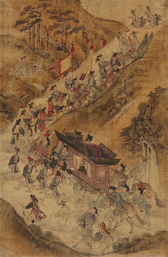 此套《平生图》按照时间顺序刻画了士大夫的一生,由8幅屏风形式的图画构成。第一幅《周岁宴》,描绘婴孩时期的主人公,身穿彩条民族服装抓周的场景。第二幅《婚礼》,展现主人公成为新郎,前往新娘家迎亲的场面。图中新郎身穿紫色长袍、头戴乌纱帽,骑于白色高头大马之上。前有马夫牵马,奴婢开道,后有穿着披风裙的问安婢,和骑在驴上的族人,一行人正浩浩荡荡往新娘家走去。第三幅《三日游街》,显示主人公状元及第,头戴御赐花,身骑白马,游街三天的情景。队伍前面是手举红牌的引路人和一路吹奏的乐队。第四幅《初次做官之路》,出现主人公初次做官,骑马带领侍从出行的场景。第五幅《观察使赴任》,描绘主人公坐于人、马共同抬的轿中,由乐队和骑兵开道,风尘仆仆赴任的情形。第六幅《判书出行》,图中绘有二品以上官员才能乘坐的带轮的轺轩,主人公坐于轺轩之上,听取下属汇报。第七幅《政丞赴任》,刻画主人公乘坐平轿深夜出行的样子,这种轿子为从一品以上官员才能使用。第八幅《回婚礼》,描绘主人公夫妇平安康乐,纪念结婚60周年的庆祝宴会。