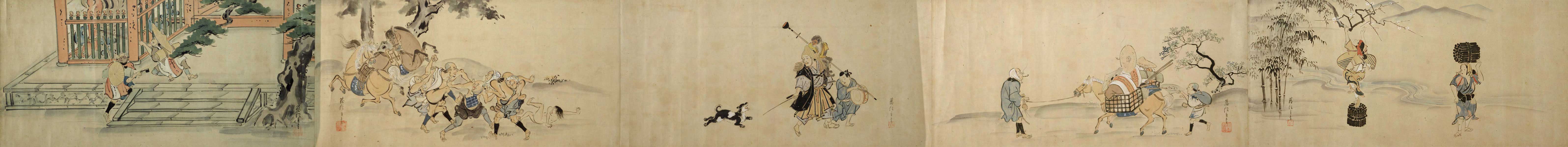 此《人物杂画图》由5幅各自独立的风俗画组成,画家以轻松幽默的笔调描绘了江户时代百姓的生活。从卷头开始依次为大原女图、巡礼骑马图、耍猴艺人图、马夫吵架图和巡礼涂鸦图。