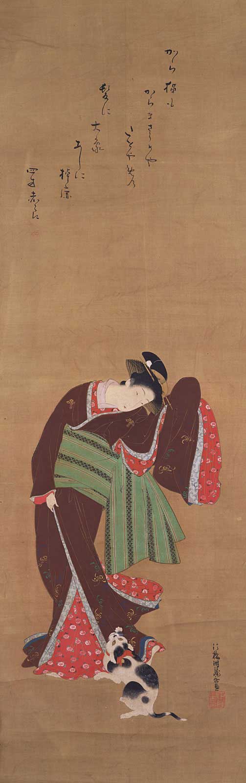 这幅《美人爱猫图》描绘了猫在美女脚下嬉戏的情景。美人衣服的下摆被小猫弄乱,为了防止露出里面的衣服,美人忙用右手按住衣摆。浮世绘常将古典名著中的人物变换姿态,以现代风俗加以表现。此画所绘美人来自《源氏物语》中女三宫的形象。因小猫被拴竹帘的绳子束缚住,使得女三公房间的竹帘不断掀起,路过的贵族无意中看到她,便一见倾心。源自这个故事,小猫弄乱美人衣服的题材在浮世绘作品中屡见不鲜,本幅即是其一。浮世绘作品还曾竞相展示当时最前沿的流行事物,人们甚至像观看时装杂志一样欣赏画作。《美人爱猫图》中美人所梳的发式,就是画家所处时代最为时髦的样式。这种被称为“灯笼鬓”的发式是在鬓角的发髻中加入鲸须等模型,使发髻两边极度张开如透明的灯笼。画中美人衣服的花纹也被细腻精致地描绘出来。衣服胸部的花纹为樱花草,这是擅长以三弦琴音乐配合说唱的富本节说唱者的象征,据此可知,画中的美人是当时富本节的年轻艺妓。画面上部有江户时代后期文人、狂歌诗人大田南亩所写的题画诗,诗中引经据典,取日本古典随笔《徒然草》之意,赞美了女性的纤弱之美。