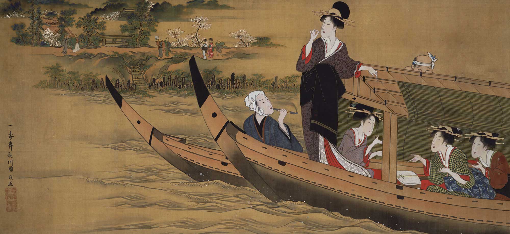 此画描绘了江户东部隅田川中的花见船。画面近处,带篷的小船载着几个艺妓模样的女子。其中三人坐于船篷下,将三弦琴放置一边,正玩划拳游戏;一人站在船头,沐浴微风,手拿牙签,眺望远方。这时,一艘朝吉原方向快速行驶的山谷船赶超过来。船上一个游手好闲的男子,口中叼烟,其视线似乎被小船上的几位女子所吸引。画面远处,可见堤岸上向岛三围神社的牌坊和前去参拜的行人,周围是盛开的樱花。