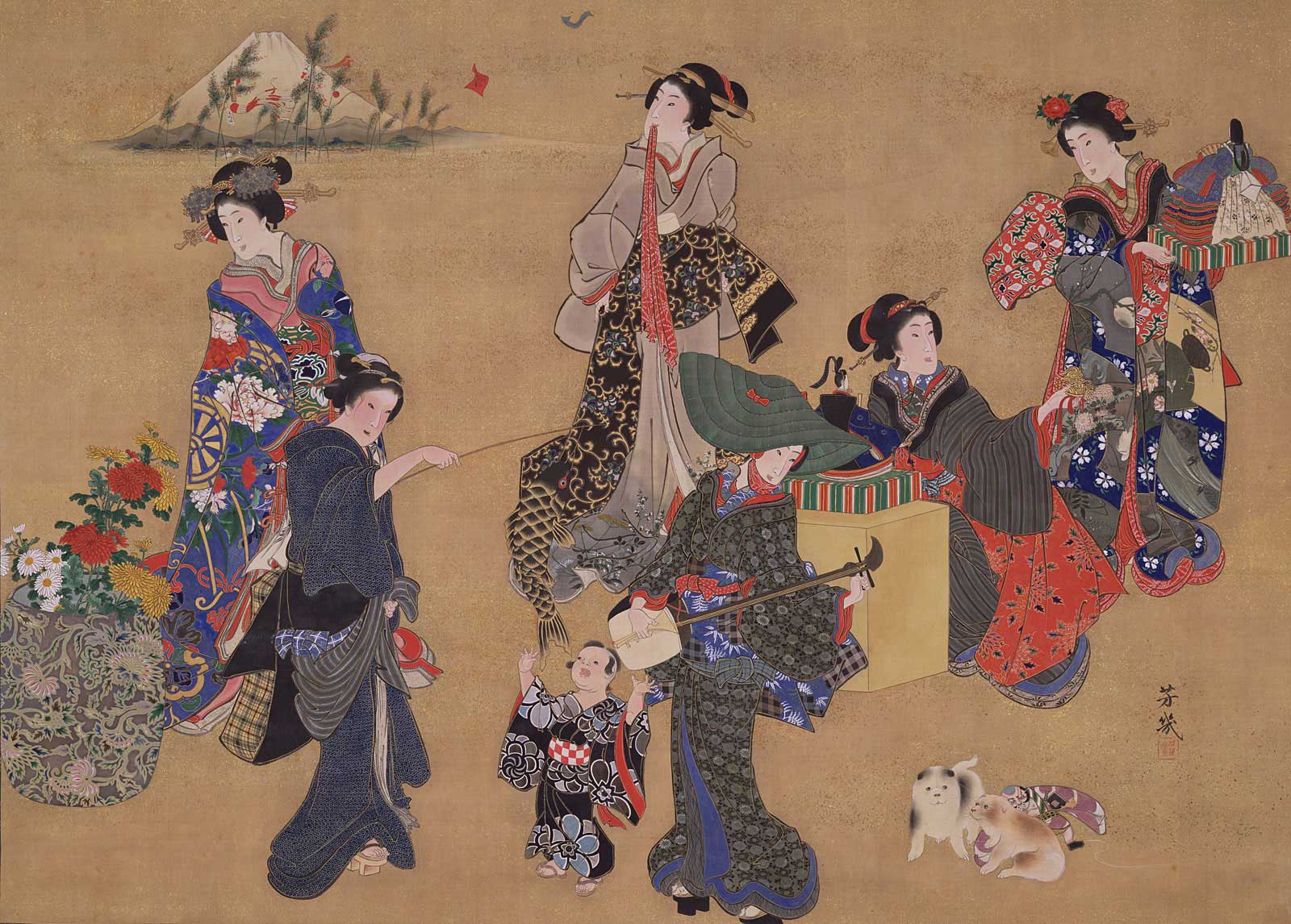 正月描绘的是驱鸟女子、风筝和嬉戏的幼犬。驱鸟是年初祈祷丰收、驱赶田间害鸟的活动。在江户时代的城市地区,活动形式发生变化,演变为头戴草笠的女艺人带三弦琴和胡琴,边唱边挨家拜访;上巳也称女儿节,自江户时代中期,作为庆祝女孩的第一个节日兴盛起来,此画描绘的两个姑娘正从箱中拿出一对偶人摆放;端午从镰仓时代起演变为主要祈祷男孩健康成长的节日,每逢过节,除菖蒲外,还要悬挂驱邪的钟馗图和祈祷出人头地的鲤鱼旗,并摆放武士偶人。此画描绘的就是一对母子在玩鲤鱼旗;七夕流行在五色诗笺上写下愿望,然后装饰于幼竹上的风俗。这一风俗除阴阳五行说外,还受到佛教超度众生法事的影响。此画不仅出现远处富士山下挂满诗笺的竹林,还有近处宽衣解带的女子;表现祈愿长寿的重阳,是一身着华服的女子立于菊花之旁。摆放菊花原是皇宫中例行的重阳活动,至江户时代,幕府将其确定为正式节日,民间也开始举办庆祝活动。