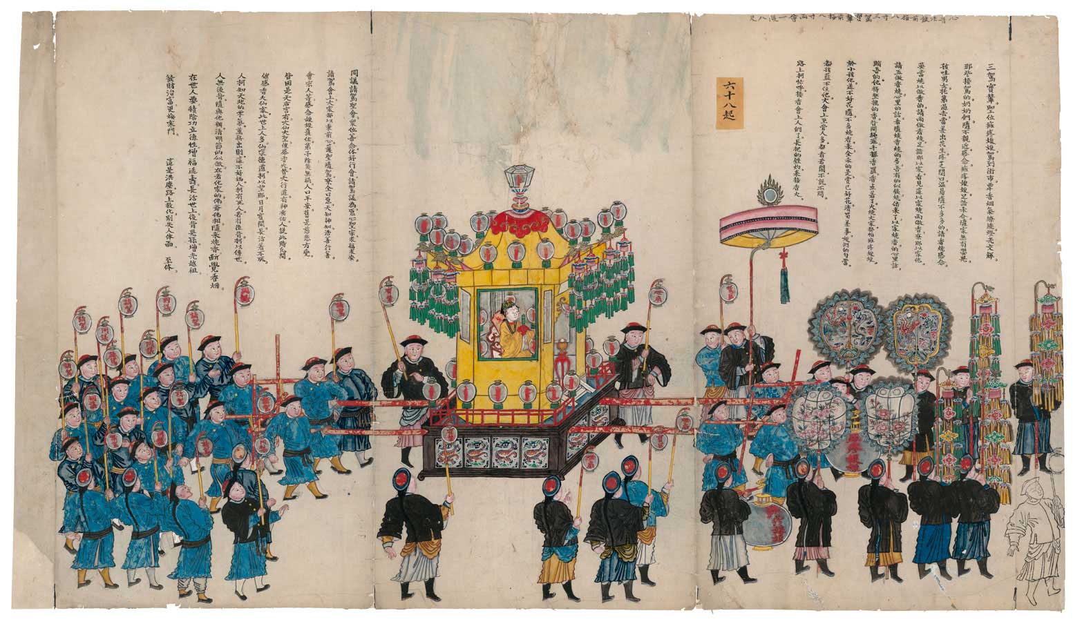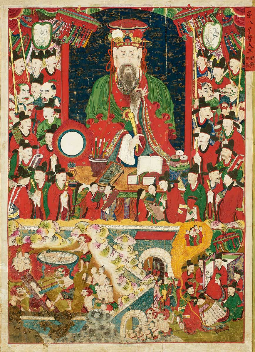 根据佛教的生死观,死者在转世之前,会在冥府里接受十王的审判。这幅《第八平等大王图》就描绘了十王中负责死后第一百天审判的第八殿大王,以及八寒八热的地狱。画面上部,平等大王头戴日月远游冠,左手捻须,右手持笏,端坐于书案之后。案上摆放着可以看到死者生前所造罪孽的业镜台,以及毛笔、笔筒、砚台、书册和卷轴等物。周围是冥界中的各种人物:有头戴乌纱、手持笏板的判官,有怀抱善恶簿的童子,还有手持利剑的狱卒。画面下部,以城墙和彩云为界,城内是地狱中的各种刑罚:有将人置于沸汤中的镬汤地狱;还有把人锯为两半的锯解地狱。旁边多人跪地,等待接受惩罚。城外,菩萨为拯救罪人,合掌而立。众人乘冉冉升起的祥云,往生极乐。