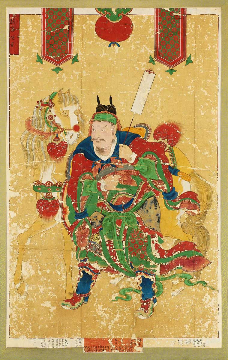 直符使者和监斋使者是人死后地狱派出的招魂使者。佛教认为,从遇到冥府使者开始,死者将在3年的时间里持续接受十王的审判。直符使者手持卷筒状名簿,传达死者姓名,将亡者带往冥府;而监斋使者则手拿斧头,被派到死者家中,防止亡者半路逃跑。在两幅画中,两位使者都被描绘为头戴尖耳帽,手持卷筒状名簿的形象,分立于白色和黄色骏马前,马儿会载着使者,将死者从今世带往冥府。画面左上角,分别写有使者姓名,以示区分。