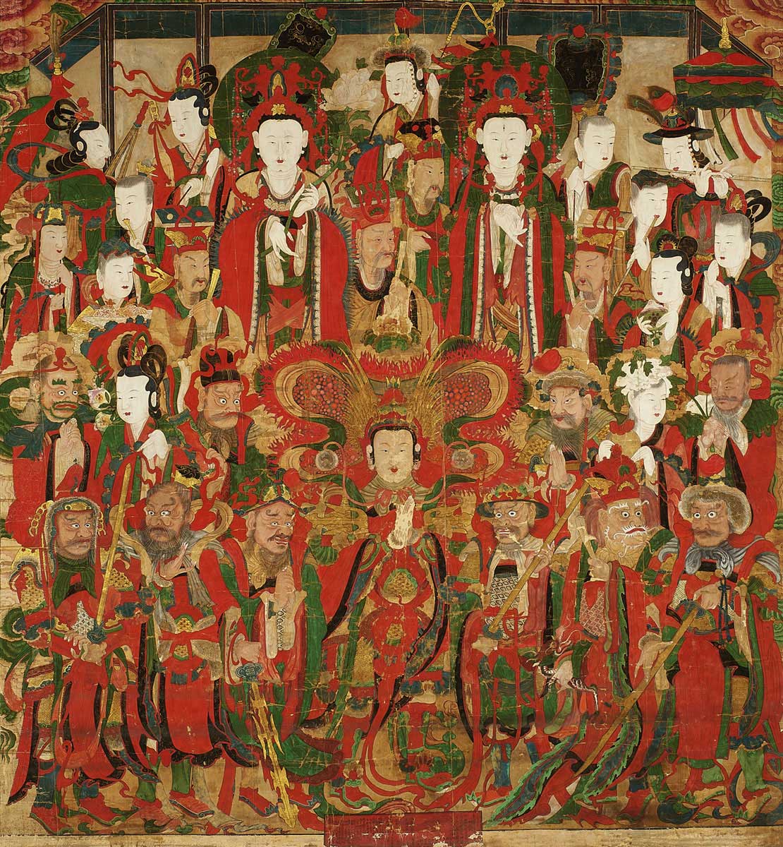 朝鲜王朝后期盛行神众信仰,几乎每座寺庙都在大雄宝殿供奉《神众图》,它们比其他佛教画更受欢迎。在高丽时代,神众信仰带有浓厚的护国性质,曾举行帝释天道场这类守护国家的仪式。至朝鲜王朝后期,则转变为重视实现个人愿望,减少灾厄,在表示佛教包容力的同时,表达一般百姓的生活与祈愿。这幅《神众图》以不透明的真彩红绿两色为主色,给人以强烈的视觉效果。部分法器和头冠使用的金色,以及天部诸神面部涂抹的白色,则带来明亮的感觉。从画记可知,佛教画由普通信众施舍,其中有些是服务于宫廷的尚宫。绘制者仁源体定等人为活跃于汉城府和京畿道的画僧。