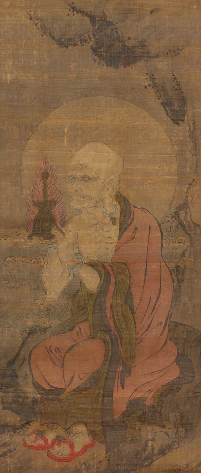 中国的罗汉信仰确立于唐末五代时期,而日本则始于11世纪初,并得到当时政治和文化主导者藤原道长的支持。至镰仓时代,尤其是在禅宗寺院中,罗汉被广泛供奉。据其姿势、持物、眷属、背景及组合方式,可分为不同体系,判定时代差异。此幅《罗汉像》以水墨勾勒背景,构图简略,没有眷属。与京都天宁寺、兵库太山寺(镰仓时代)及京都建仁寺(南北朝时期)本《罗汉像》相似,可见不同时代对罗汉图样的继承。