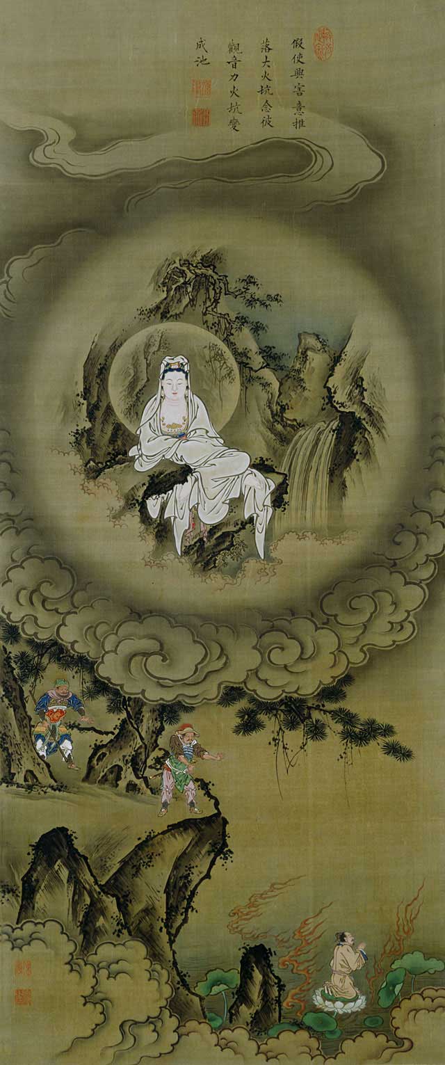 此画为33幅一套《观音变相图》之一。《观音变相图》是依据罗什译本《法华经》第二十五品之《观世音菩萨普门品》)中内容,描绘观音自在变化三十三种化身,解救众生苦难的三十三个场景。这幅表现的是,只要感念观音之力,即使投身火坑,火坑也会变成水池。此套图像与京都东福寺收藏的明兆绘于应永19年(1412年)的《三十三观音图》基本一致。
