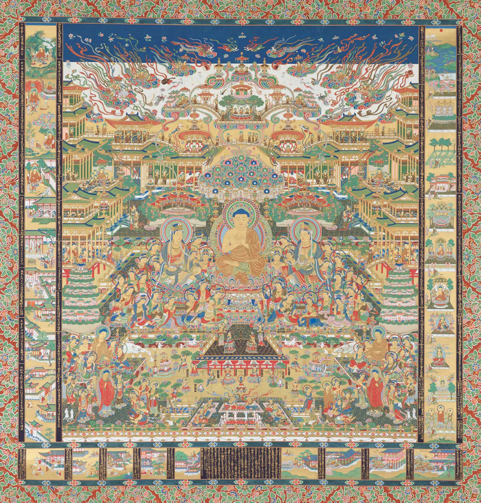 全画描绘了净土三经中《观无量寿经》的内容。画面中部表现的是无量寿净土图。左侧自下而上描绘了阿阇世在提婆达多唆使下,不仅幽禁父王频婆娑罗王,还幽禁试图阻止他恶行的母亲韦提希夫人,韦提希夫人向释迦牟尼寻求对安乐世界说法的场景。画面右侧自上而下描绘了释迦牟尼向韦提希夫人讲解观想无量寿佛的身相和极乐净土庄严的十六种观想方法的场景。下方自右向左出现了往生极乐净土世界的九种品类——九品往生。下方中部用泥金书写《当麻曼荼罗图》的由来。