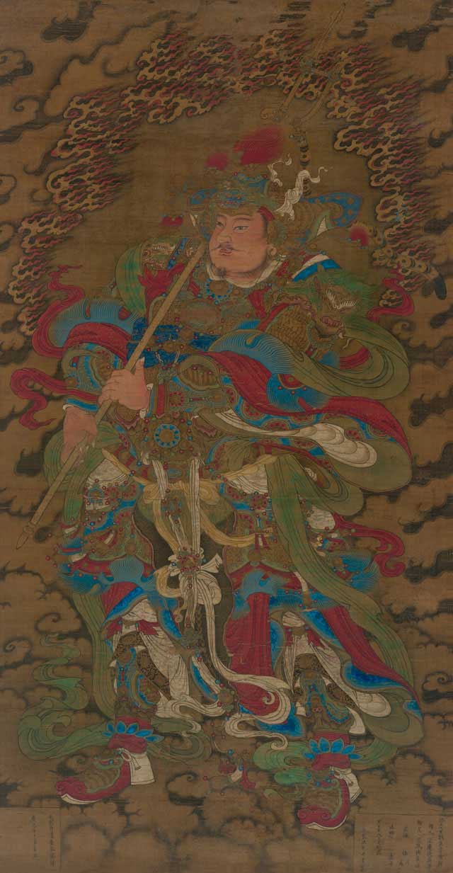 此幅《护法天王像》为立姿武将形象,头戴龙头宝冠,身披鱼鳞铠甲,双手共持一戟,有火焰纹头光。整幅画面,纹饰细密、衣带飘扬,面部刻画生动,造型雄健丰满,线条繁复流畅,设色浓丽饱满。