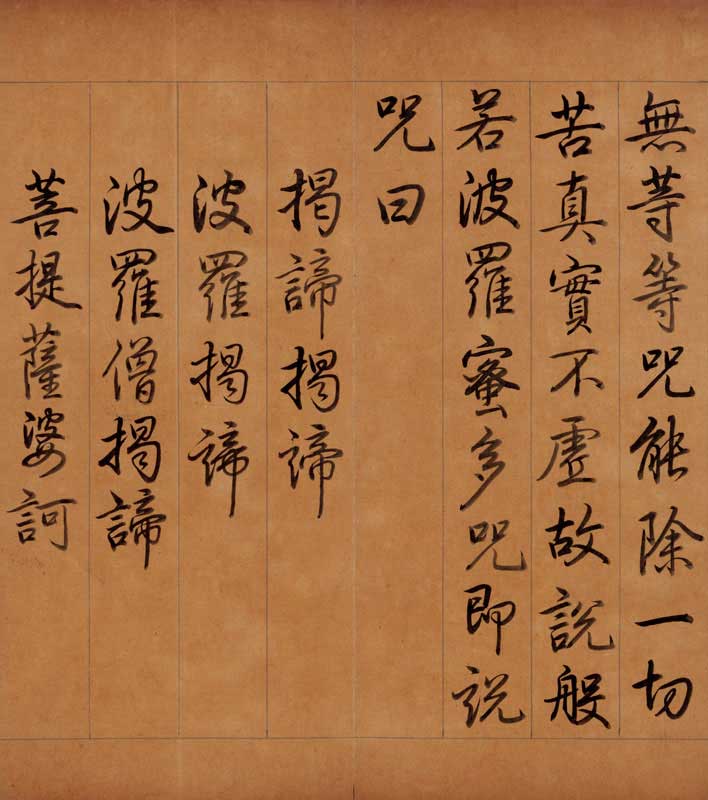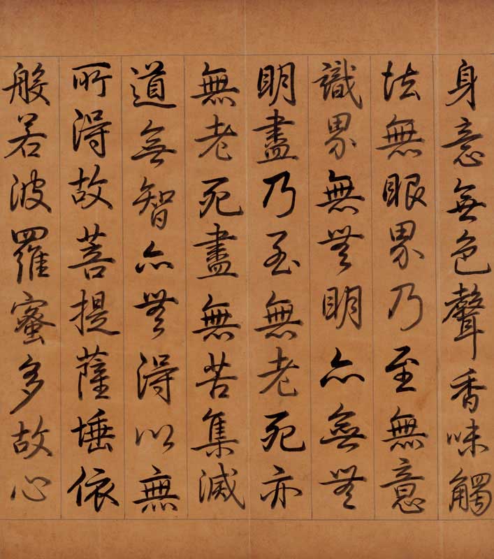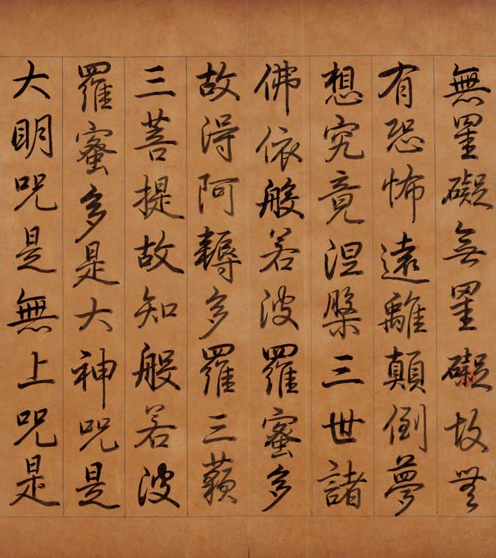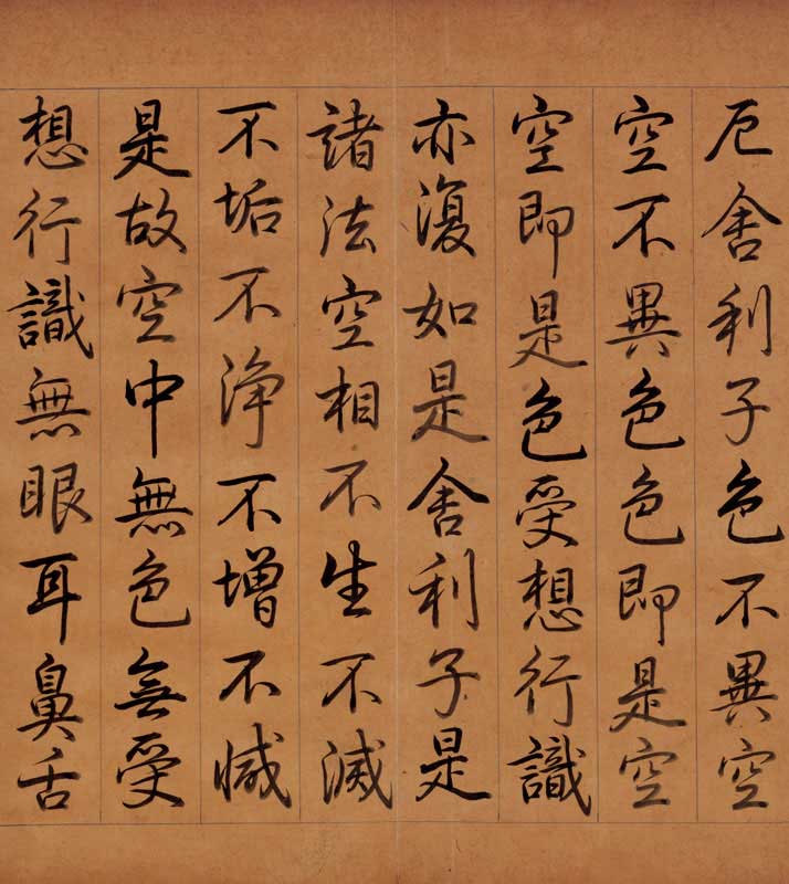 这册《御笔心经并绘大士像》为经折装形式,是乾隆皇帝(1711—1799年)于乾隆十八年(1753年)元旦所书《般若波罗蜜多心经》(简称《心经》)。《心经》是佛教一部重要典籍,虽篇幅短小,但浓缩了佛学大乘思想的精要,被誉为群经之首、万法之典。清代帝王多信奉佛教,乾隆皇帝一生就曾多次抄写此经。乾隆皇帝的书法用笔圆润、结体端庄,但缺少顿挫和变化。这篇《心经》保持了其书法一贯的风格特点,笔划秀丽、端庄圆润,没有太多的顿挫和起伏。