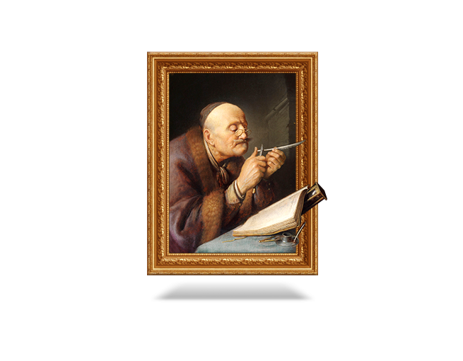 格里特·德奥(Gerrit Dou)是伦勃朗在莱顿的第一位学徒,他在十七世纪以绘画技巧和题材的创新而闻名。与他的老师伦勃朗不同的是,伦勃朗以一种广阔、流畅和具有强烈表现力的方法来作画,而德奥发明了一种名为“精细画”(fijnschil—derijen)的技巧。这种绘画要求非常精细而准确的笔触来刻画近距离的场景。他在肖像画、对学者或做家务的人的描绘之中,都蕴含着对于材料、表面质地和所在空间错觉的精准把握。德奥使用日常生活中熟悉的题材,以石头窗台为背景主题,人物则斜向窗外,似乎进入了观众所在的空间。他的作品《伏在画家画室壁架上的猫》(1657年)以一种戏谑的方式体现出的上述技法,特别是对于空间错觉的描绘广受同时期荷兰和外国画家所称道。