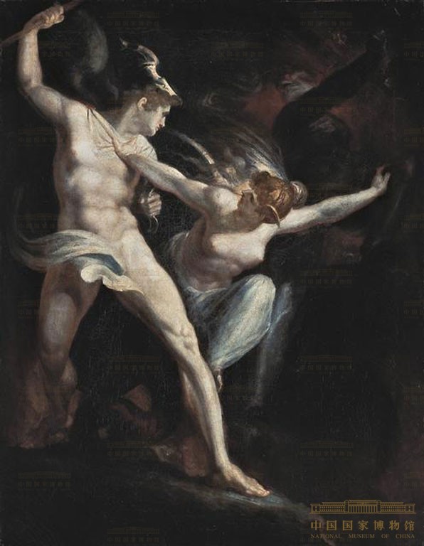 Fuseli frequently chose themes from European literature as subjects for his artwork. This painting is based on a passage from Milton's epic poem Paradise Lost, the biblical battle between the forces of the underworld. Satan, depicted on the left, is attacking Death but restrained by the intervention of Sin, who seeks to unify the two in the battle against Good. Fuseli portrays Evil as an alluring temptress, the seductive antithesis to a religious paradise believed lost.