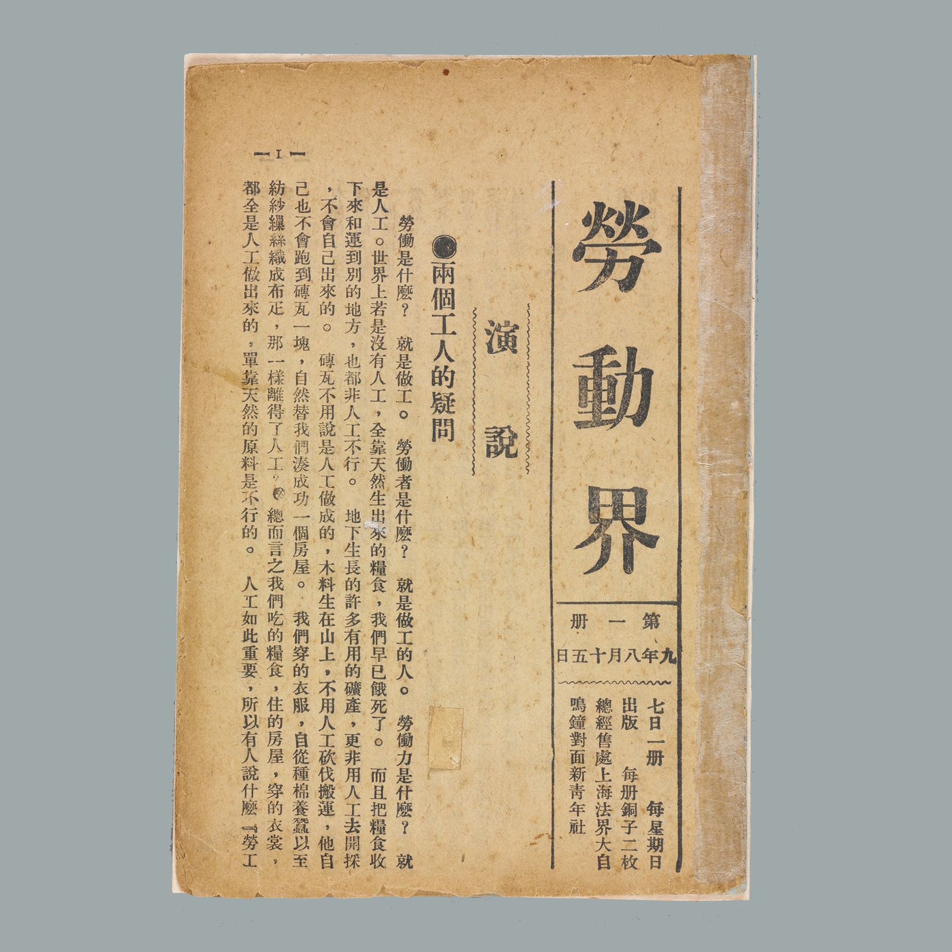 上海共产党早期组织出版的通俗读物《劳动界》 纵17.8厘米,横12.1厘米,厚0.2厘米