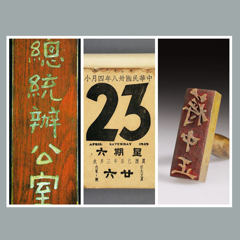 南京国民政府总统办公室的木牌、日历及蒋介石的铜印 木牌:纵27厘米,横8.9厘米;日历:纵17.7厘米,横12.5厘米;铜印:纵9.2厘米,横3.3厘米,高10.4厘米