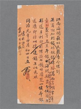 苏松太道吴煦为筹集进攻太平天国的经费向英商阿加刺银行借款的借据 纵25.3厘米,横12厘米