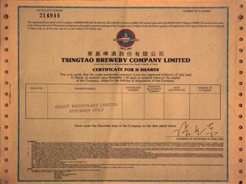 山东青岛啤酒股份有限公司发行的H股股票 纵21.3厘米,横27厘米