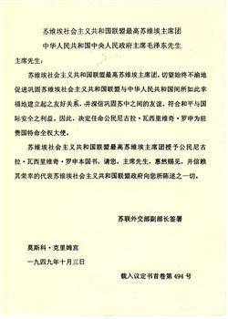 苏联首任驻华大使罗申向毛泽东递交的国书译文 纵28厘米,横21厘米