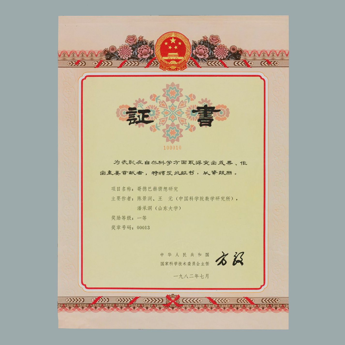 陈景润等荣获的国家科学技术委员会颁发的自然科学一等奖证书 纵33.9厘米,横25厘米