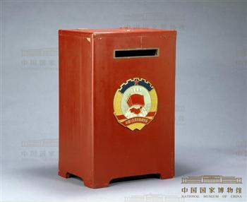 中国人民政治协商会议第一届全体会议选举用的票箱 长39.8厘米,宽30.3厘米,高62.8厘米,正面有政协会徽