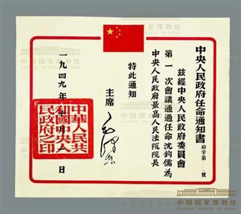 中央人民政府任命沈钧儒为最高人民法院院长的任命书 纵27厘米,横32厘米