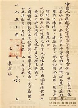 北京市军管会收回市内外国兵营地产布告 纵73.5厘米,横53.2厘米