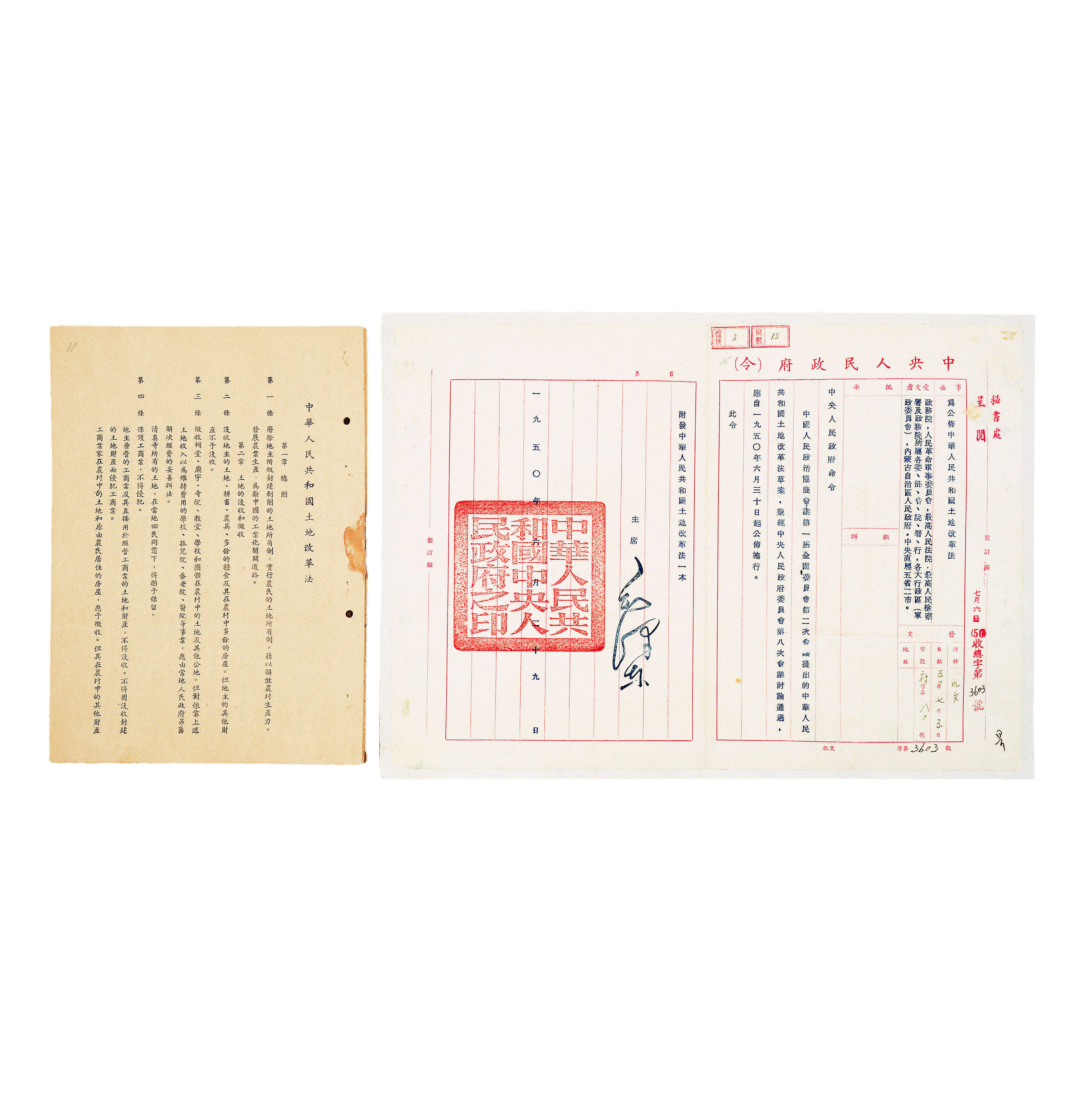 中央人民政府公布土地改革法的命令纵26.5厘米,横37.5厘米纸质,打印、铅印