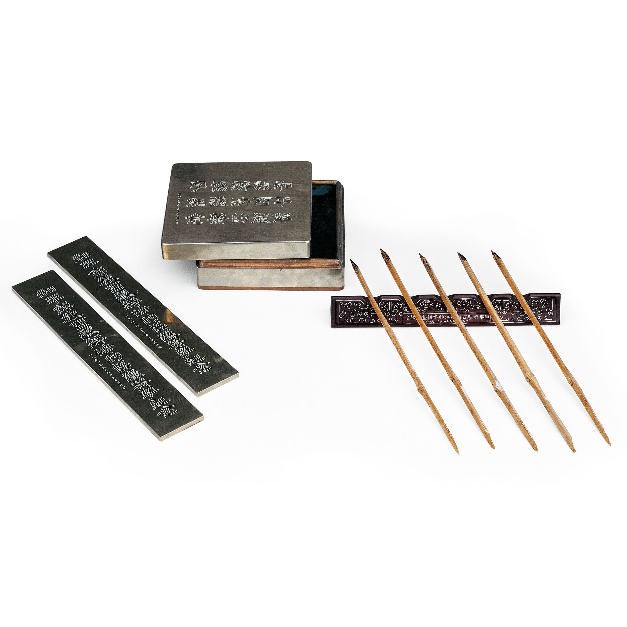 签订《中央人民政府和西藏地方政府关于和平解放西藏办法的协议》时用的文具最长30.8厘米毛笔4支,竹、毛质;竹笔5支;笔架2个,木质;墨盒2个,镇尺4个,铜质