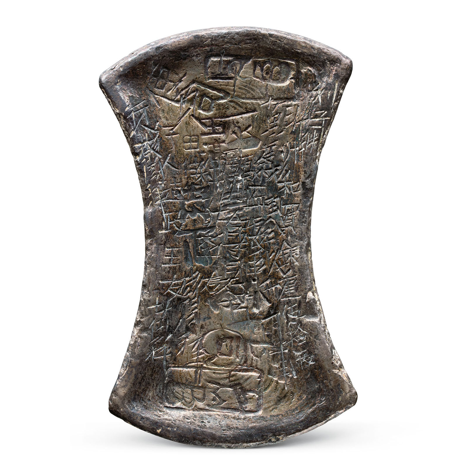 “沂州五十两”银锭 长14.1厘米,两端分别宽8.3、8.5厘米,厚2.4厘米