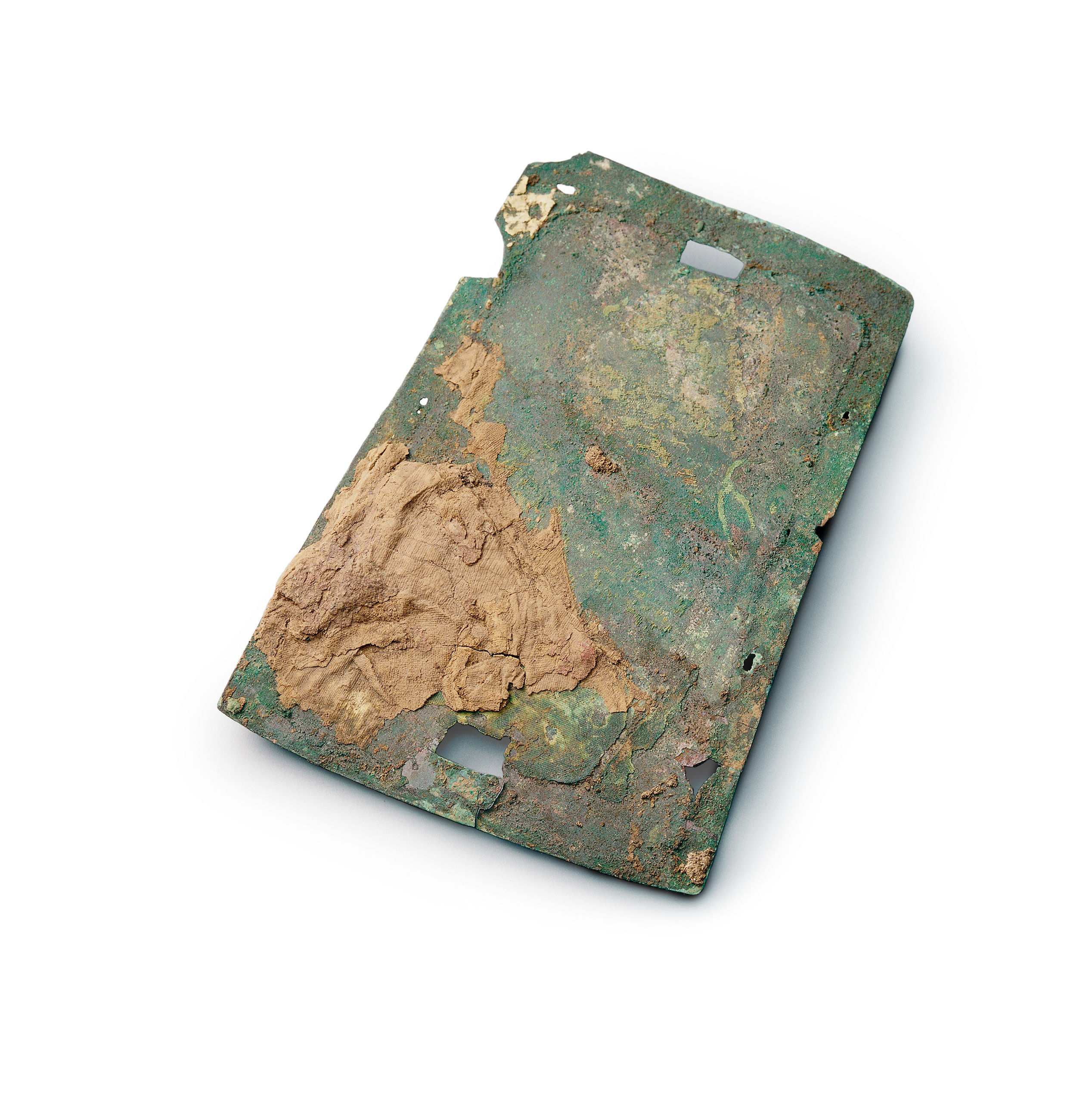 粘有平纹绢残迹的青铜片 长19.8厘米,宽14.1厘米1953年河南安阳大司空出土