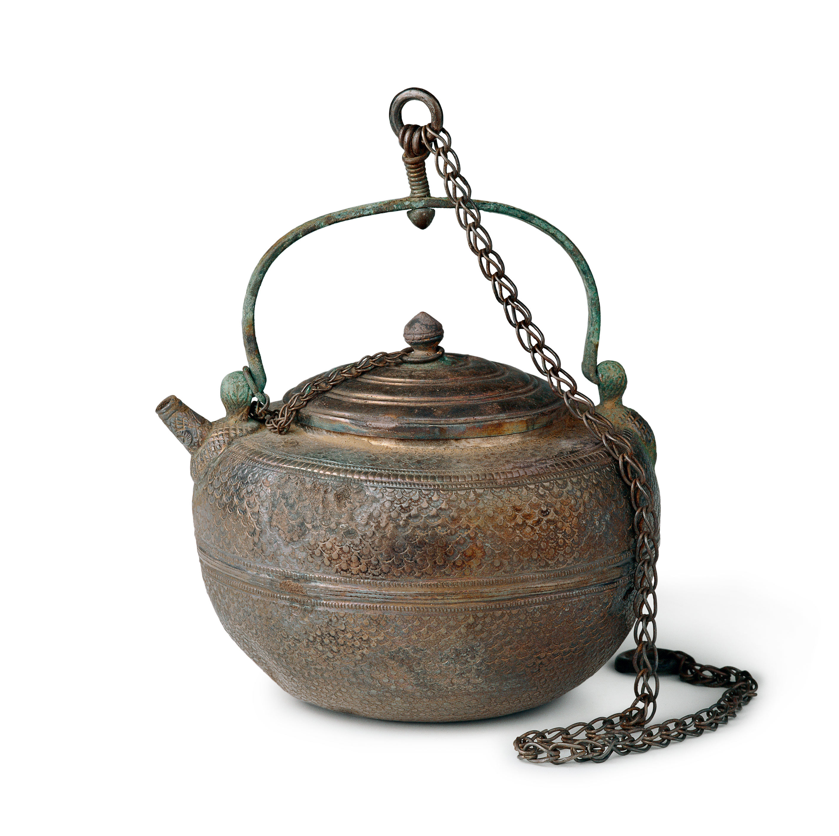鳞纹银壶 高10.7厘米、口径7.2厘米、链长41厘米