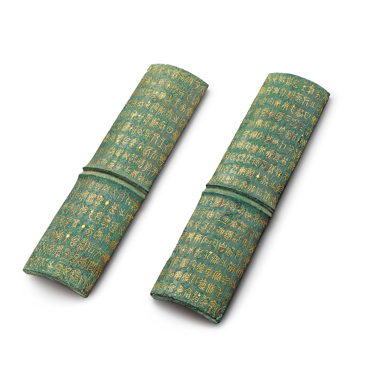 “鄂君启”错金青铜节 舟节(右)长30.9厘米,宽7.1厘米,厚0.6厘米;车节(左)长29.6厘米,宽7.3厘米,厚0.7厘米