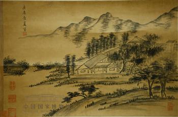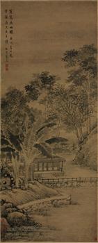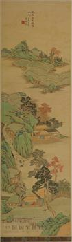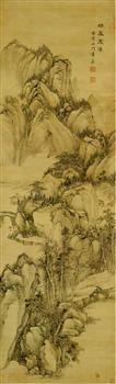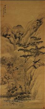 《山居图轴》 钱度 作。绢本,设色,纵85.5厘米,横26厘米