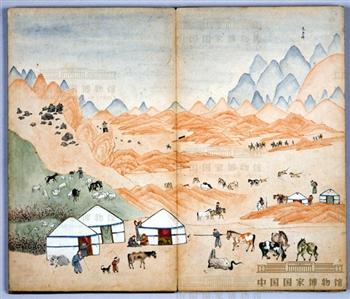 《西域回疆图册》 明福绘 作。纸本,设色,每开纵36.8厘米,横43.9厘米